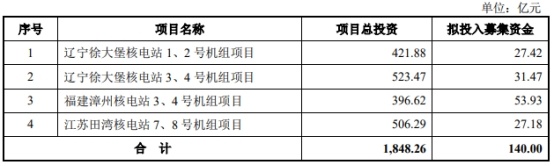 中国核电2024年8月31日披露的2024年度向特定对象发行A股股票募集说明书(申报稿)显示,公司本次向特定对象发行股票拟募集资金总额(含发行费用)不超过140.00亿元(含本数),扣除发行费用后的募集资金净额将全部用于以下项目:“辽宁徐大堡核电站1、2号机组项目”“辽宁徐大堡核电站3、4号机组项目”“福建漳州核电站3、4号机组项目”“江苏田湾核电站7、8号机组项目”。