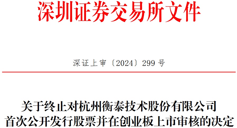 中国经济网北京11月29日讯 深交所网站昨日披露关于终止对杭州衡泰技术股份有限公司(简称“衡泰技术”)首次公开发行股票并在创业板上市审核的决定。