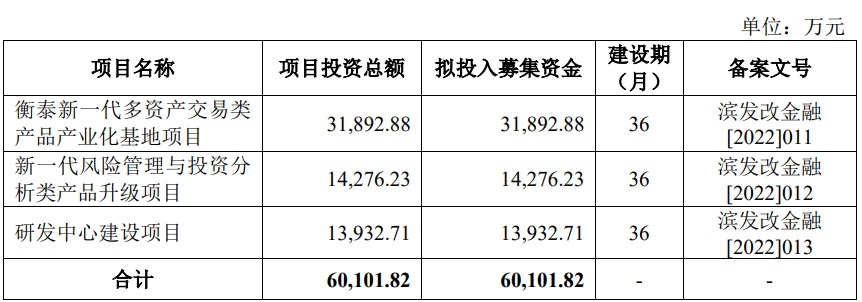 衡泰技术原拟在深交所创业板公开发行人民币普通股(A股)量不超过11,386,578股,不低于发行后总股本的25%。衡泰技术原拟募集资金60,101.82万元,计划分别用于衡泰新一代多资产交易类产品产业化基地项目、新一代风险管理与投资分析类产品升级项目、研发中心建设项目。