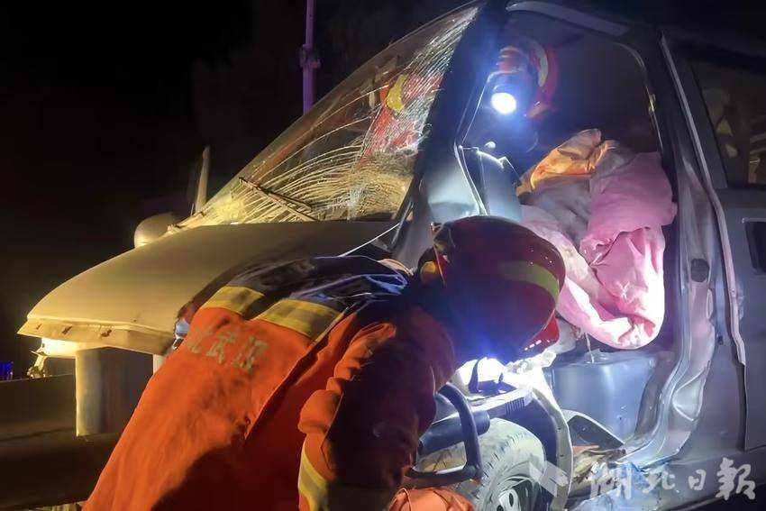 湖北日报讯(记者严运涛、通讯员汉消)11月26日凌晨1时22分,武汉市汉南区马影河大道上发生一起交通事故,一辆面包车在撞上路边护栏后,致一名驾驶员被困车内。接警后,武汉市消防救援指挥中心立即调派兴一路消防救援站出动1辆消防车、6名消防员赶赴现场处置。