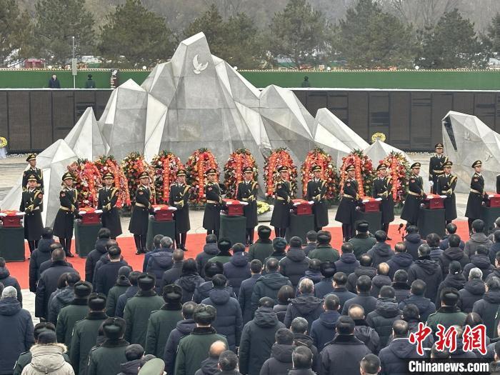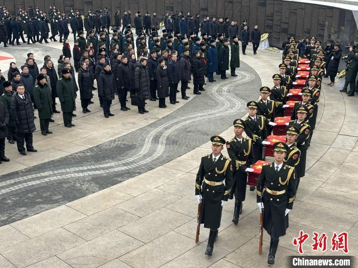 29日上午,第十一批在韩中国人民志愿军烈士遗骸安葬仪式在沈阳抗美援朝烈士陵园举行。苍松翠柏之间,黑色花岗岩雕成的烈士英名墙环绕着纪念广场,在冰点以下的气温中更显肃穆。
