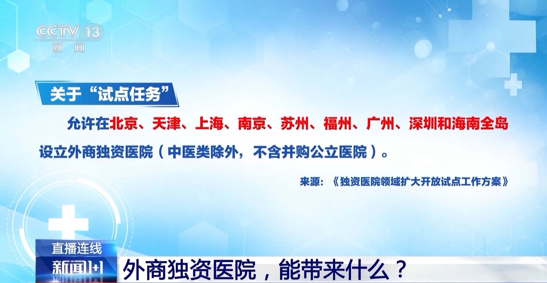 11月29日,四部门印发《独资医院领域扩大开放试点工作方案》,允许在北京、天津、上海、南京、苏州、福州、广州、深圳和海南全岛设立外商独资医院(中医类除外,不含并购公立医院)。这一方案的实施对药品研发、医疗服务、患者体验有什么影响?进一步放宽外资准入,允许设立外商独资医院试点如何展开? 《新闻1+1》本期关注:外商独资医院,能带来什么?
