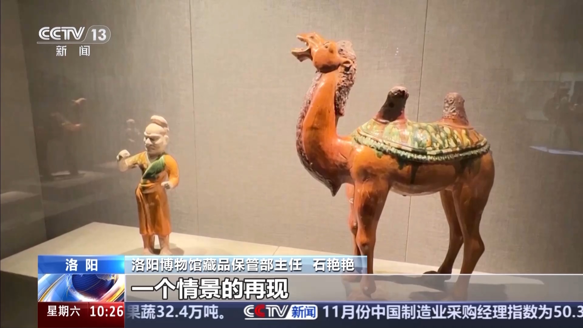 洛阳博物馆藏品保管部主任 石艳艳:这组文物体现了一个胡人牵着他心爱的骆驼,从西域来到东都洛阳的一个情景的再现。在墓葬中出土,它经常会和很多的骆驼一起出土,所以,我们很多都把它命名成三彩牵驼俑。