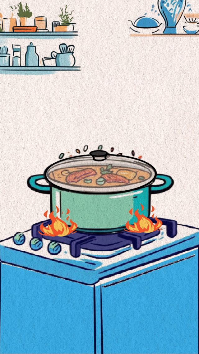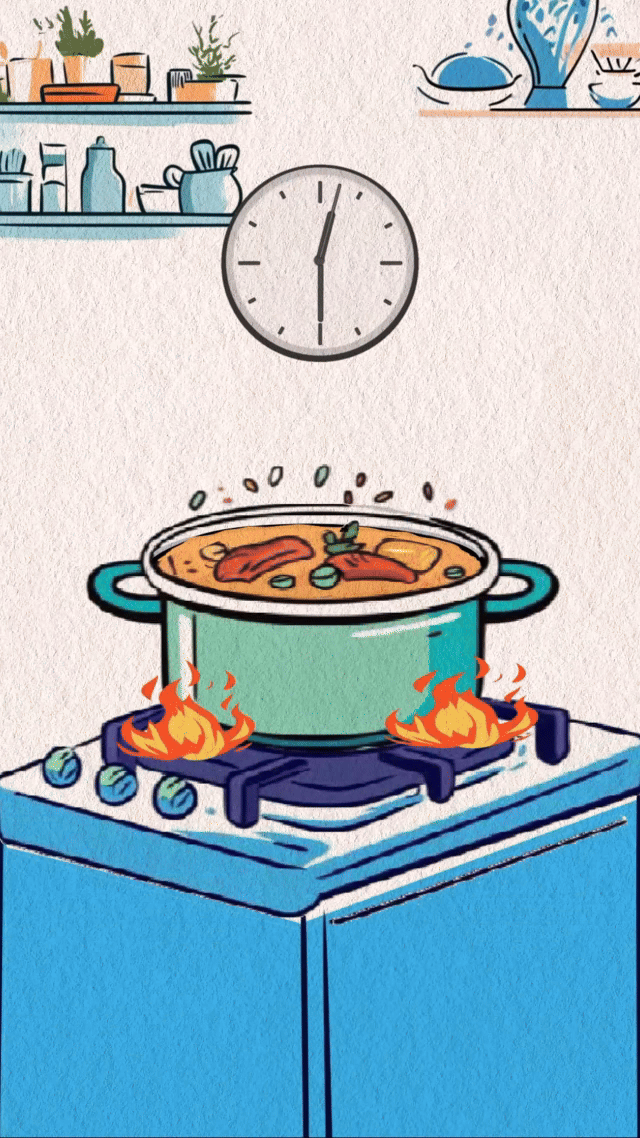 此时,燃气灶上的排骨汤正一点点地被烧干。危险悄然逼近。