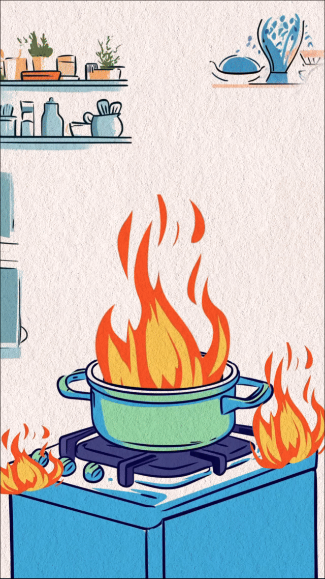 小明闻到了奇怪的气味,走到厨房一看,眼前的景象顿时令他惊慌失措——锅中已燃起熊熊火焰,情况危急。