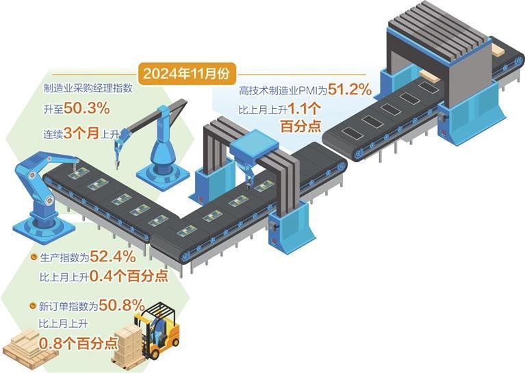 “11月份,存量政策和一揽子增量政策对新动能和消费品制造业带动效果较为突出。”中国物流信息中心专家文韬说。装备制造业PMI为51.3%,与上月持平,但生产指数接近54%,较上月上升0.8个百分点,新订单指数也与上月持平,稳定在52%以上。高技术制造业PMI为51.2%,较上月上升1.1个百分点,其中生产指数较上月上升2.6个百分点至53%,新订单指数较上月上升1.2个百分点至51.4%。消费品制造业PMI为50.8%,较上月上升1.3个百分点,在10月份短暂收缩后再次回到扩张区间,且生产指数和新订单指数都较上月上升超过2个百分点至52%以上。