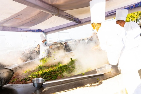 其中,一尊巨大的“天下第一锅”成为全场焦点,锅内现场烹饪宿迁特色美食王官集瓦块鱼,鲜香四溢的场景引得众多游客纷纷驻足观看。与此同时,现场的文创集市也是热闹非凡,这里汇聚了来自宿迁各地的特色美食以及精美的手工艺品,琳琅满目的商品让游客们应接不暇。