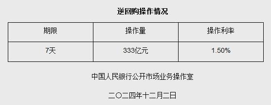 中新网12月2日电 据央行网站消息,为维护银行体系流动性合理充裕,2024年12月2日人民银行以固定利率、数量招标方式开展了333亿元逆回购操作。具体情况如下: