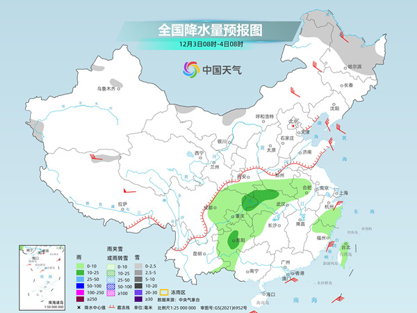 今明天(12月2日至3日),冷空气继续影响我国,东北等地降温明显,并伴有大风,需注意防范。降水方面,今天,东北地区降雪减少、减弱。明后天,东北仍有降雪,南方降水将发展增多。