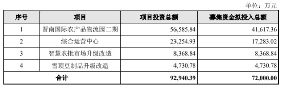 浙江东日2024年4月30日披露的向特定对象发行股票证券募集说明书(申报稿)(2023年年度财务数据更新版) 显示,公司本次向特定对象发行股票募集资金总额不超过72,000.00万元(含72,000.00万元),所募集资金扣除发行费用后,拟用于以下项目的投资:晋南国际农产品物流园二期、综合运营中心、智慧农批市场升级改造和雪顶豆制品升级改造。