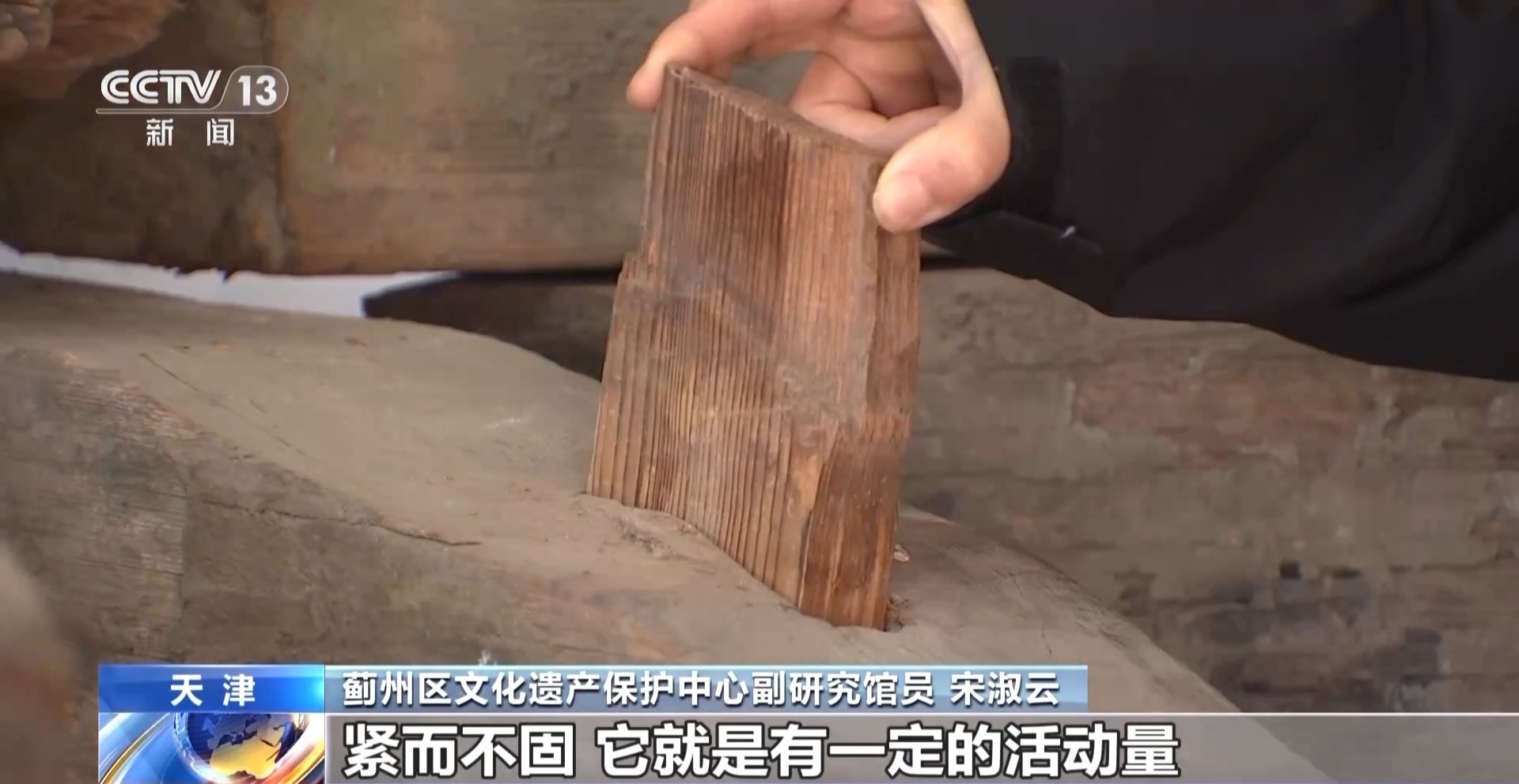蓟州区文化遗产保护中心副研究馆员 宋淑云:这组斗拱破损比较严重,所以把它们撤下来了。它们的连接部位是不会有钉子的,它们主要采用了榫卯结构,底下都是榫,插在这儿紧而不固,它就是有一定的活动量,所以当来地震的时候,它虽然摇摆,但是震后它能够恢复原位。
