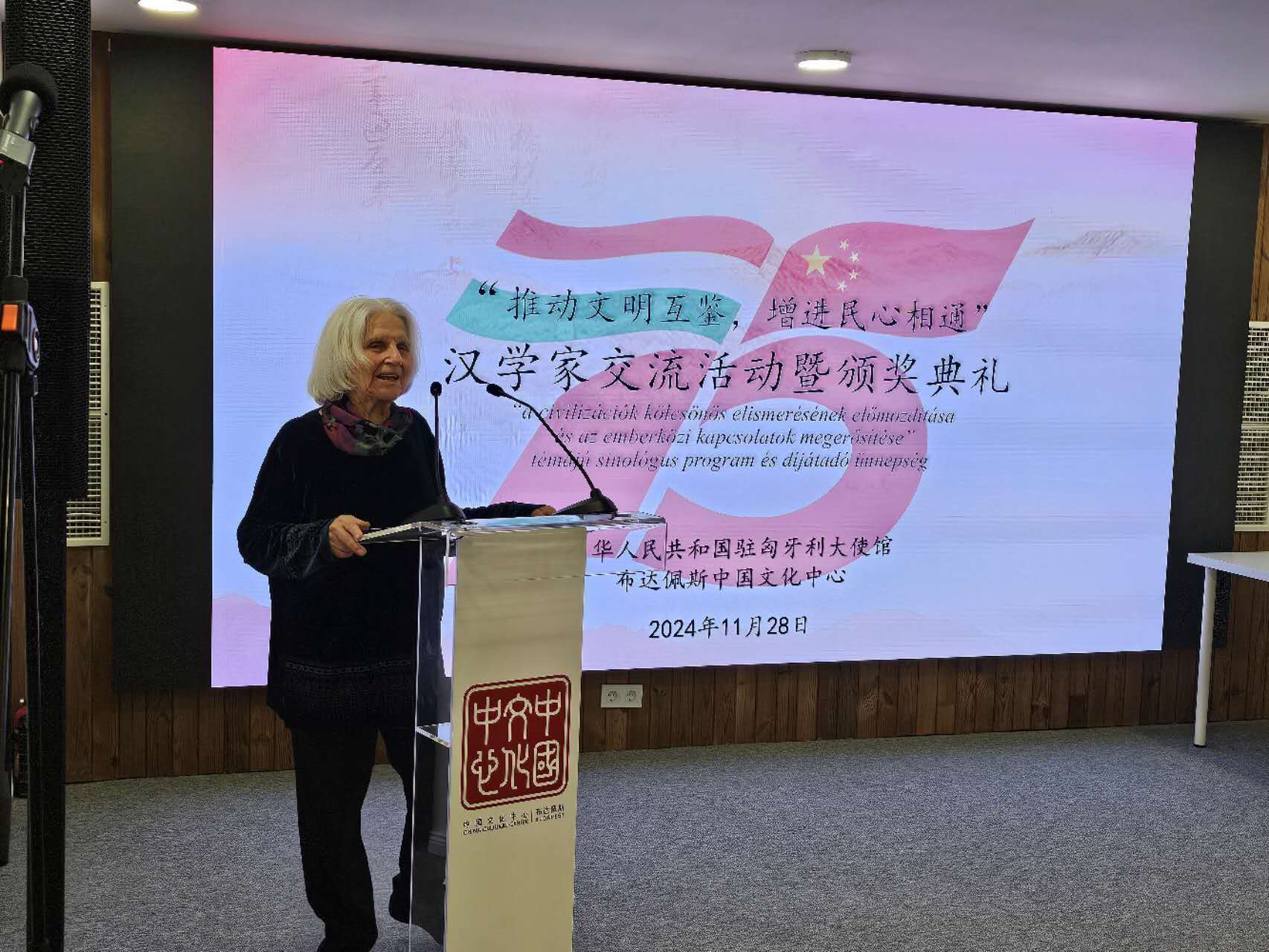 姑兰表示,非常幸运可以学到中文这一世界上最美的语言之一,并将其作为自己终身的职业。感谢使馆的表彰,这不只是对她个人的认可,更是对匈牙利汉学家群体的激励。希望有更多掌握中文、喜爱中国文化的匈牙利朋友们参与两国各领域友好交流合作,为匈中友好关系发展做出积极贡献。