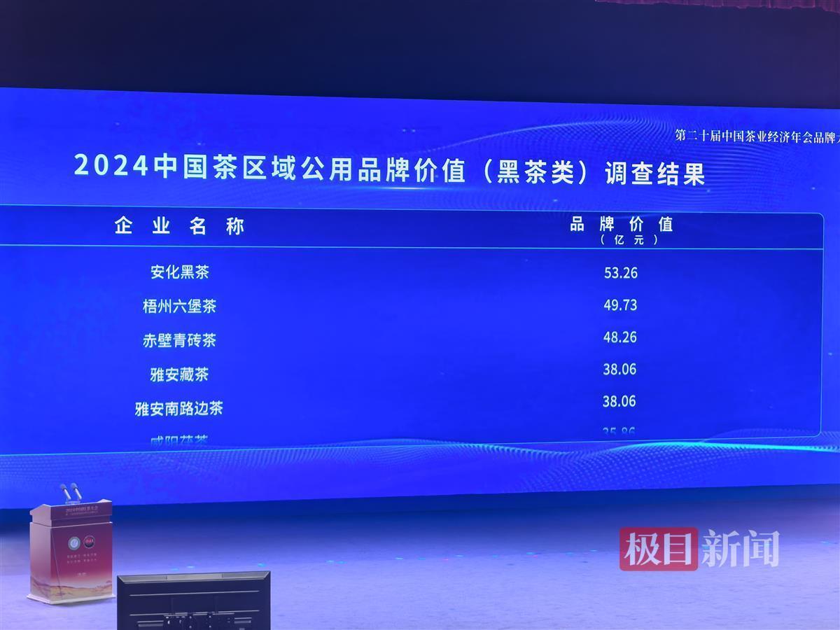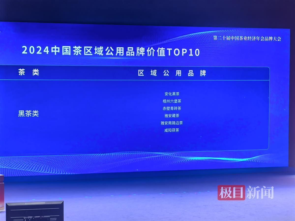 赤壁市上榜2024年度茶业践行新质生产力十大县域,赤壁市政协主席、茶产业链常务副链长宋慧宇代表赤壁上台领奖;2024中国茶区域公用品牌价值(黑茶类)调查结果发布,赤壁青砖茶品牌价值48.26亿元,排名第三;2024年度茶业重点(原百强)县域调查结果发布,赤壁市上榜,排名第六;2024年度茶业重点(原百强)企业调查结果发布,赤壁市赵李桥塔峰茶业股份有限公司上榜,排名120;2024中国茶企业品牌价值排名top10(黑茶类),羊楼洞茶业股份有限公司的品牌羊楼洞排名第二,湖北省赵李桥茶厂有限责任公司的川字牌排名第七。