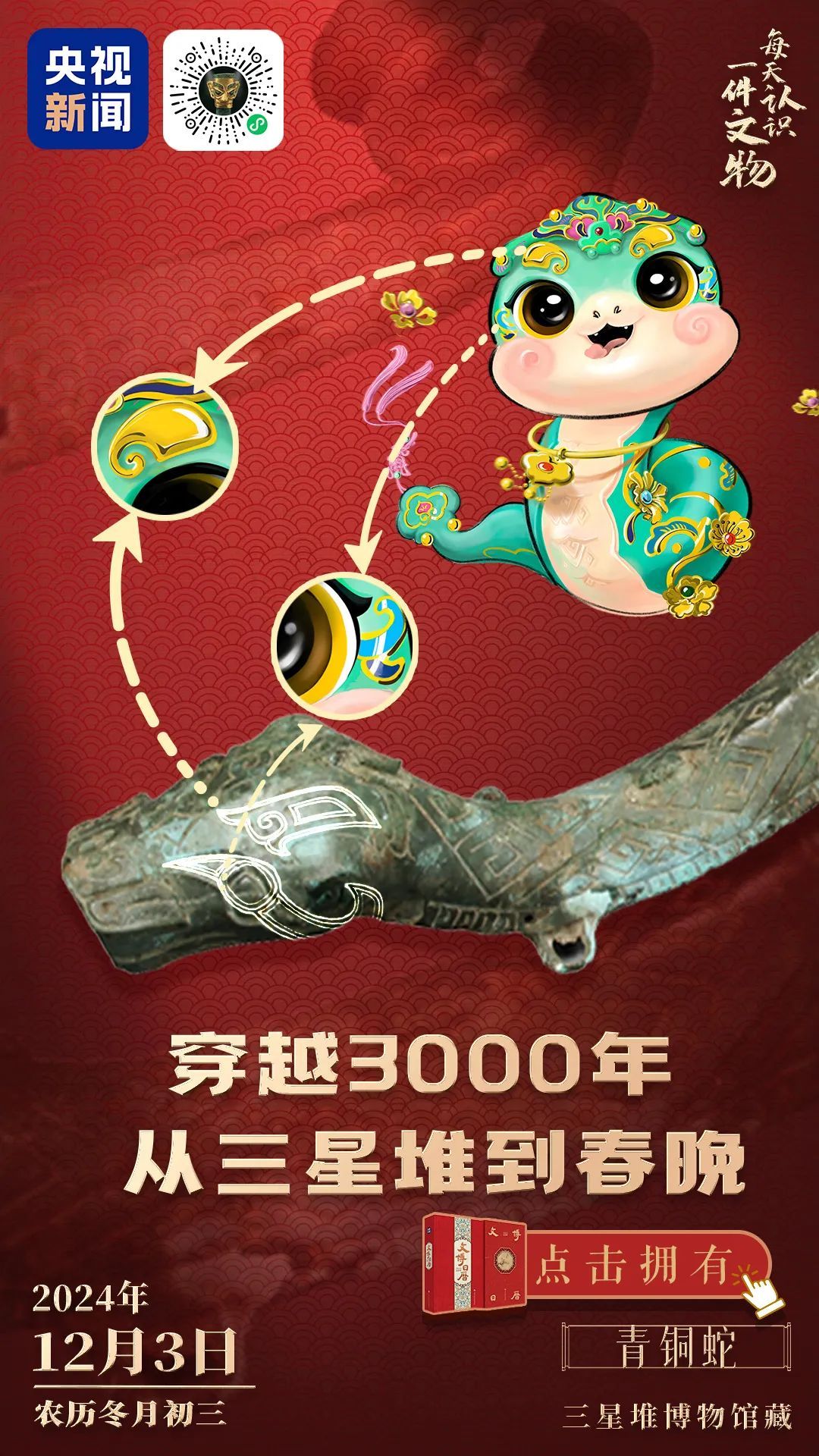 2025年总台春晚吉祥物“巳(sì)升升”,整体造型参考了甲骨文中的“巳”字,圆溜溜的大眼睛,灵感来源于三星堆青铜蛇的臣字目;跳跃的眉梢,源自青铜蛇的“歧羽纹”……蛇年将至,提前祝大家巳巳如意,一起期待蛇年春晚!