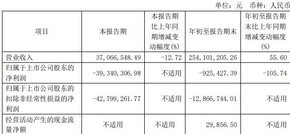 年初至报告期末,公司实现营业收入2.54亿元,同比增长55.60%;归属于上市公司股东的净利润-92.54万元;归属于上市公司股东的扣除非经常性损益的净利润-1286.67万元;经营活动产生的现金流量净额为2.99万元。