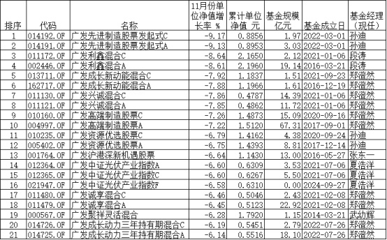 中国经济网北京12月3日讯 今年11月份,广发基金管理有限公司旗下21只(各份额分开计算,下同)权益类基金下跌超过6%,广发先进制造股票发起式C、广发先进制造股票发起式A分别以9.17%、9.13%的跌幅垫底。