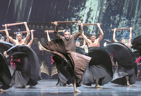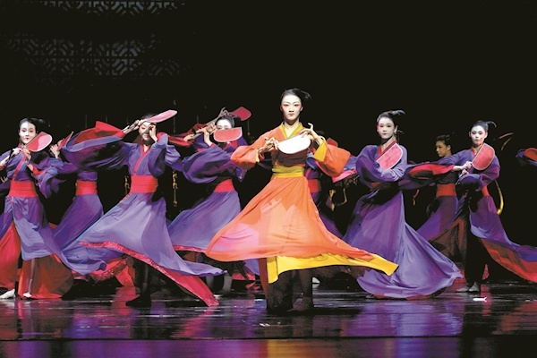 浑厚的鼓点声中,男子踏歌而起,舞动的铜剑划过天穹,骁勇善战的楚地雄风呼之欲出;灯光暗下又亮起,一群女子手持旌羽、身着华服,水袖轻甩、刀扇掩面,丰姿绰约间尽显楚舞“翘袖折腰”的风格……