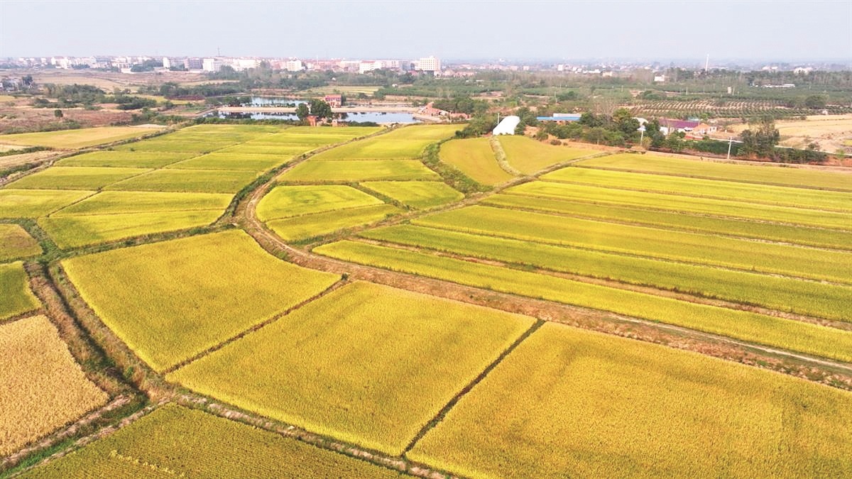 从高空俯瞰,孝昌县邹岗镇的万亩稻田与乡村农舍、蓝天白云相互映衬,构成一幅金光灿烂的美丽乡村田园画卷。