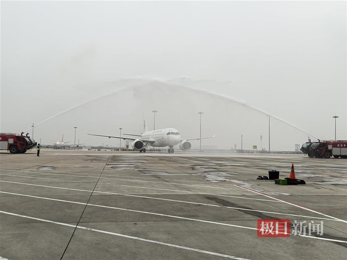 12月4日,中国东航C919国产大飞机又添“上海虹桥-武汉天河”这一新航线。当天11时08分,东航使用C919执飞MU5385航班,搭载着142名旅客从上海虹桥国际机场飞抵武汉天河国际机场,并受到民航最高礼仪“水门礼”的热烈欢迎。这标志着C919正式执飞“汉沪快线”,武汉也成为继上海、成都、北京等地后,东航C919商业通航的第8座城市。