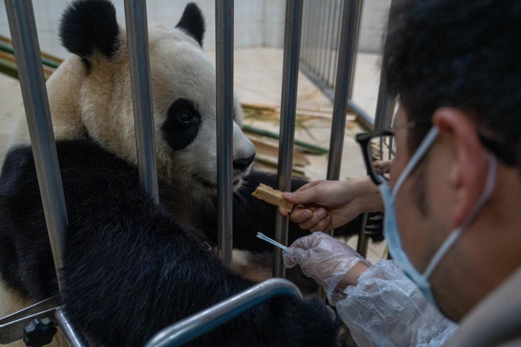 12月4日上午,兽医在采集大熊猫“福宝”的口腔拭子做进一步检测。新华社记者 薛晨 摄