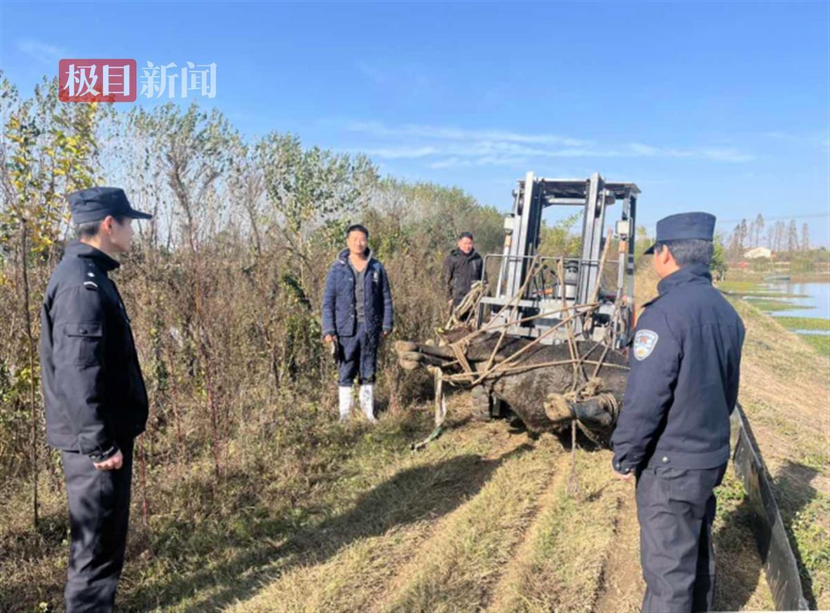 民警迅速联系叉车救援队,将困在水沟里的牛救出。