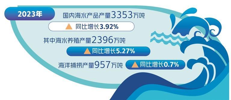 “近年来,各地加强生产指导,紧抓稳产保供,推进产业发展,促进渔民增收,海洋渔业总体保持良好发展态势,为‘菜篮子’产品稳定供给和农业农村经济发展作出积极贡献。”农业农村部渔业渔政管理局有关负责人表示,2023年,国内海水产品产量3353万吨,同比增长3.92%,其中海水养殖产量2396万吨,同比增长5.27%,海洋捕捞产量957万吨,同比增长0.7%。海水产品市场供应充足、价格平稳、质量安全。在此基础上,海水养殖产业进一步优化,深远海养殖加快发展,设施装备支撑效果显著增强,海洋渔业资源养护和利用制度不断完善。