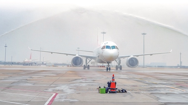 12月4日,中国东航C919国产大飞机又添“上海虹桥-武汉天河”新航线。当天11时08分,东航使用C919执飞MU5385航班,搭载着142名旅客从上海虹桥国际机场飞抵武汉天河国际机场,受到民航最高礼仪“水门礼”的热烈欢迎。此次飞行标志着C919正式执飞“汉沪快线”,武汉也成为继上海、成都、北京等地后,东航C919商业通航的第8座城市。这也是继上月中国国航C919执飞北京—武汉航线以来,武汉天河机场迎来的第二条C919航线。