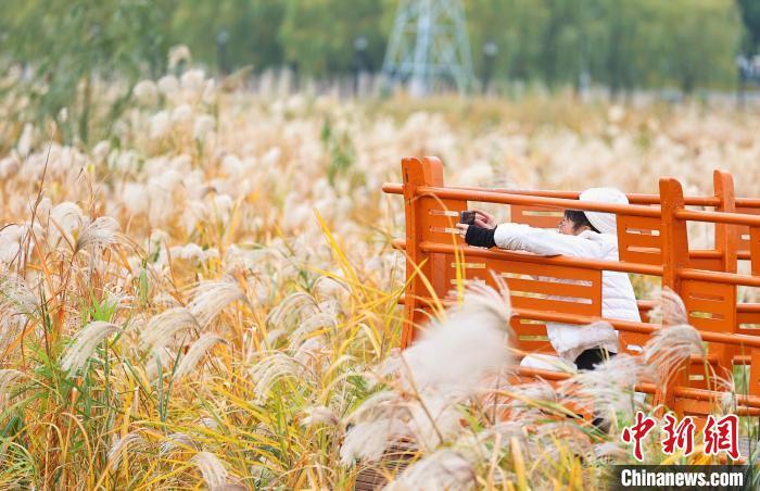 12月5日,湖北武汉,汉口江滩6公里芦苇荡的芦花和荻花盛开,飞絮如雪,如梦如幻。市民与游客纷至沓来漫步其中,或拍照留影,令人流连忘返。图为市民在盛开的芦狄花前拍照留影。中新社记者 张畅 摄