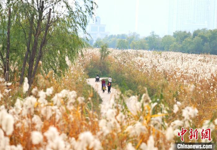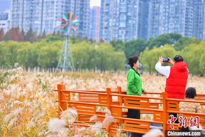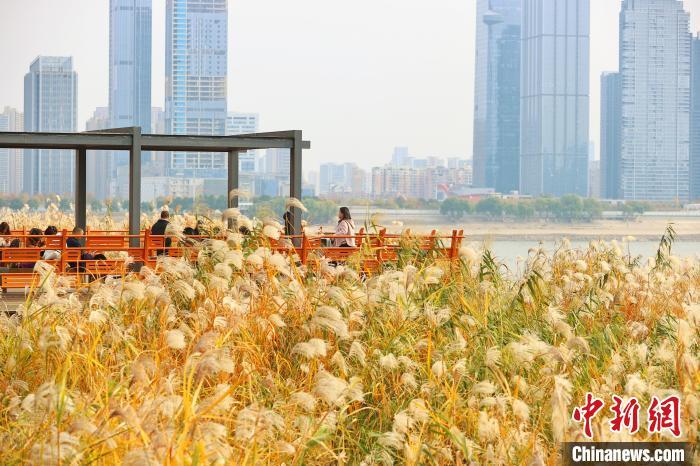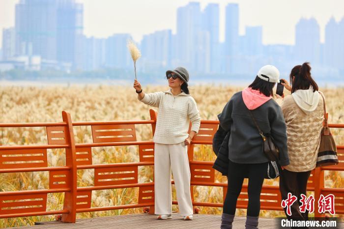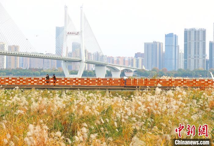 12月5日,湖北武汉,汉口江滩6公里芦苇荡的芦花和荻花盛开,飞絮如雪,如梦如幻。市民与游客纷至沓来漫步其中,或拍照留影,令人流连忘返。图为市民漫步栈道中观赏盛开的芦狄花。中新社记者 张畅 摄