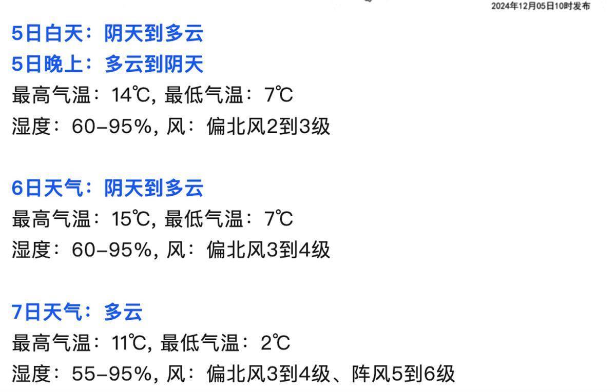 湖北日报讯(记者汤炜玮、通讯员武气象)12月5日从武汉市气象局获悉,明天有一轮冷空气到达武汉市,云系较多,气温逐步降低。另外,下周起还有一股冷空气到达,同时受高空波动东移影响,武汉市还有降水发生,白天最高气温也会降至个位数。
