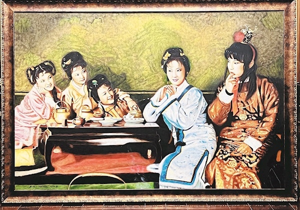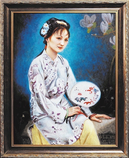 沈琳:是从2010年开始的,那时候我的孩子10岁了,我可以抽离一部分精力,去做自己喜欢做的事情。先是自己买画材,摸索了一段时间,发现自己没有进步,于是拜画家王剑为师,跟着他学油画。人物、风景、静物都画,我刚开始画人物的时候,画的是我自己的剧照,后来选了几幅《红楼梦》剧照一起画,像王熙凤、宝黛读西厢记等几件作品都是一起画的。这么多年下来,我已经画了23幅了。这次在深圳的画展,是我第五次办展,之前有时是和别人的画一起参展的,这次是展出我画红楼人物画作最多的一次。