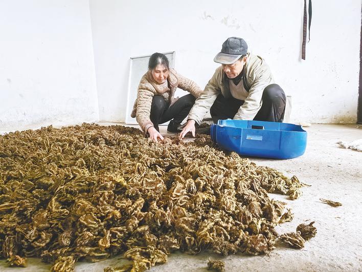 11月20日,利川市建南镇大道角村连农黄学富正在将烘干的黄连装袋。