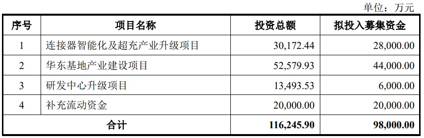 永贵电器2024年11月19日披露的向不特定对象发行可转换公司债券募集说明书(申报稿)显示,公司本次可转债的发行总额不超过人民币98,000.00万元(含本数),扣除发行费用后将用于连接器智能化及超充产业升级项目、华东基地产业建设项目、研发中心升级项目、补充流动资金。
