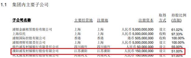 浦发银行(600000.SH)年报显示,溧阳浦发村镇银行股份有限公司为持股51%的主要子公司。