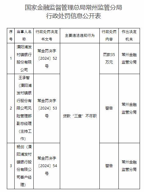 常州金融监管分局决定对溧阳浦发村镇银行股份有限公司处以罚款35万元,对王承智、杨剑处以警告。