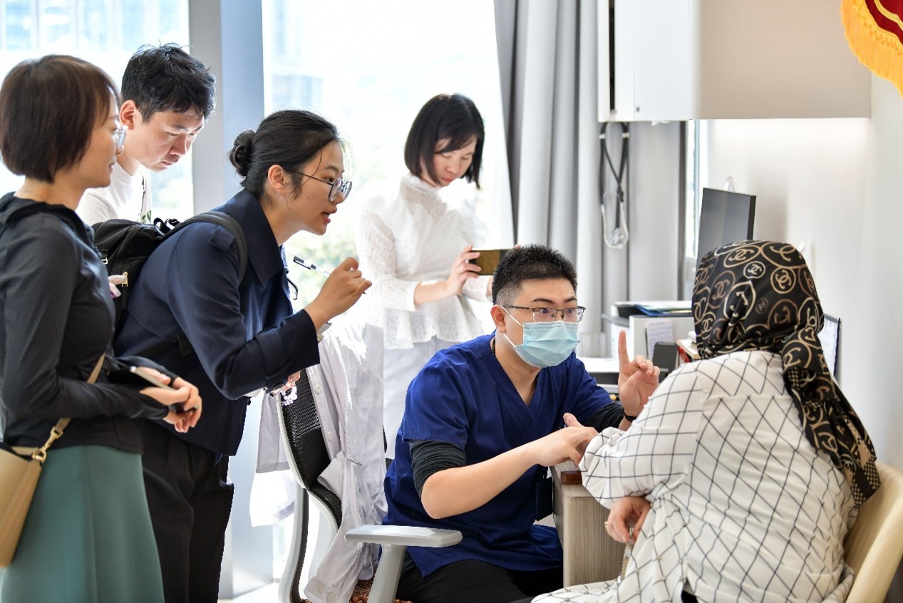 在桂湾街道,采风团一行走进前海国际人才港社康站。在这里,外国友人对中医号脉展现出浓厚兴趣。