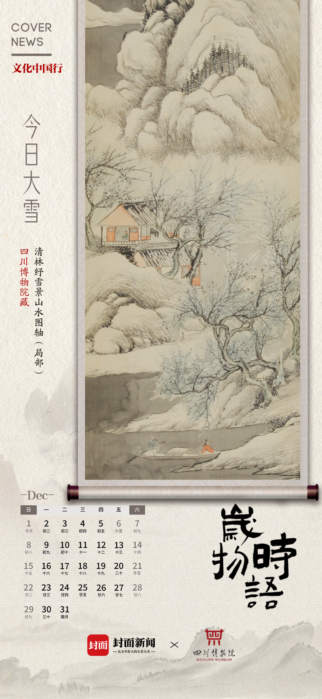 而在蜀地之上的四川博物院,就馆藏了多幅与冬日有关的书画。其中,一幅清林纾雪景山水图轴,就将“安得北风从海上,满天吹过玉纷纷”的动人景象描绘得栩栩如生。此外,还有一幅清代的黄鼎蜀山积雪图轴,图中画重峦迭峰,山峰劲挺,山中树木稀疏,一派寒林景色。小桥、屋舍蔽隐于溪边树丛中。此图笔墨秀润,清丽萧疏,画中景物的高低、晕淡、深浅,都极自然。
