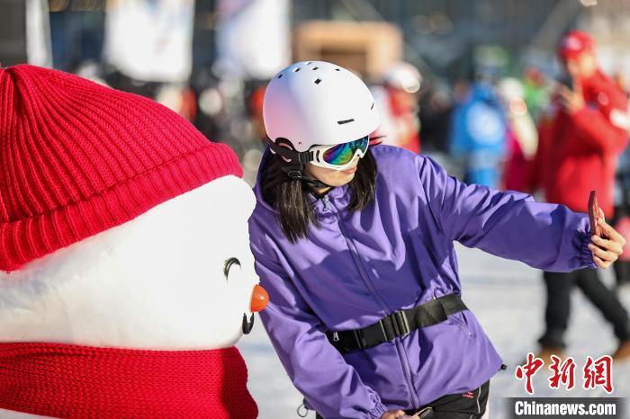 12月8日,2024-2025“冬日雪暖阳·撒欢儿在沈阳·身心齐欢畅”冰雪季开板仪式在沈阳举行。图为游客在滑雪场与雪人合影。中新社记者 于海洋 摄