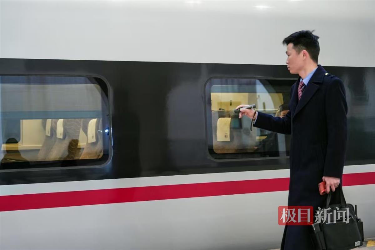 在值乘前,程双强提前3个小时起床赶到乘务队,他要在开车前对动车组列车进行细致入微的“体检”。极目新闻记者在荆门西站1站台看到,他手持检测设备,在列车的各个关键部位穿梭,从车身的外观到车下的复杂机械结构,从电气系统到制动装置,每一个环节都不放过。“不管哪条线路,开往哪里,确保列车安全运行都是我的首要任务,这是对旅客负责,也是对我自己的职业操守负责。”