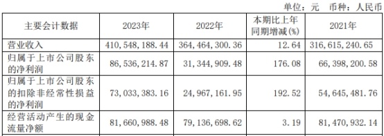 2023年,泛亚微透营业收入为4.11亿元,同比增长12.64%;归属于上市公司股东的净利润0.87亿元,同比增长176.08%;归属于上市公司股东的扣除非经常性损益的净利润0.73亿元,同比增长192.52%;经营活动产生的现金流量净额0.82亿元,同比增长3.19%。