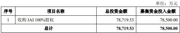 本次发行募集资金总额不超过78,500.00万元,扣除发行费用后的募集资金净额全部投资于收购JAI 100%股权。