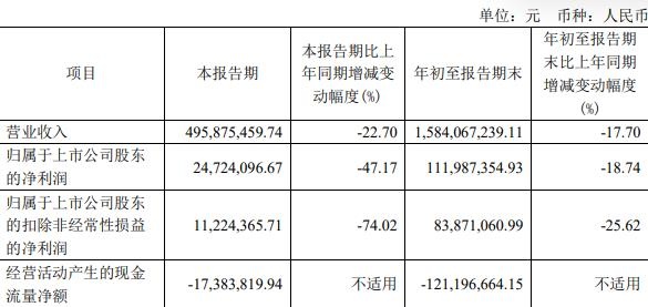 年初至报告期末,公司实现营业收入15.84亿元,同比减少17.70%;归属于上市公司股东的净利润1.12亿元,同比减少18.74%;归属于上市公司股东的扣除非经常性损益的净利润8387.11万元,同比减少25.62%;经营活动产生的现金流量净额为-1.21亿元。