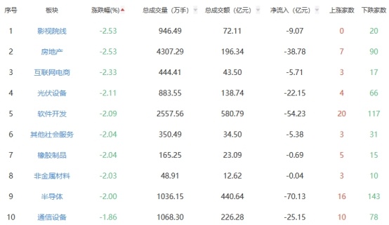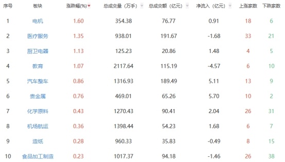 盘面上,电机、医疗服务、厨卫电器等板块涨幅居前,影视院线、房地产、互联网电商等板块跌幅居前。