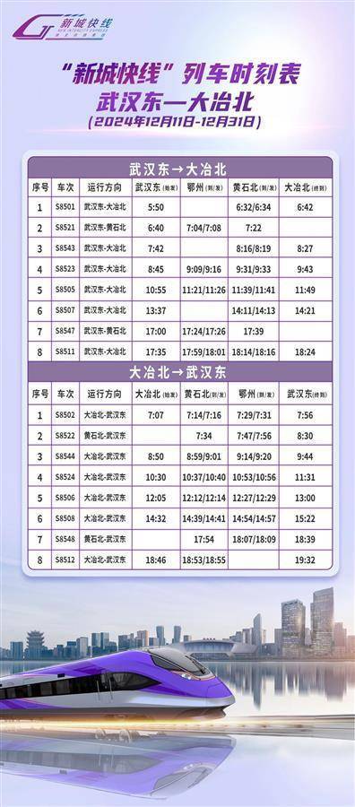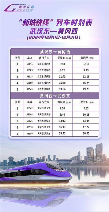湖北日报讯 (记者戴辉、通讯员李晶晶)来自湖北铁路集团轨道运营有限公司的消息,12月11日至12月31日期间,“新城快线”列车将实行新时刻表组织开行。