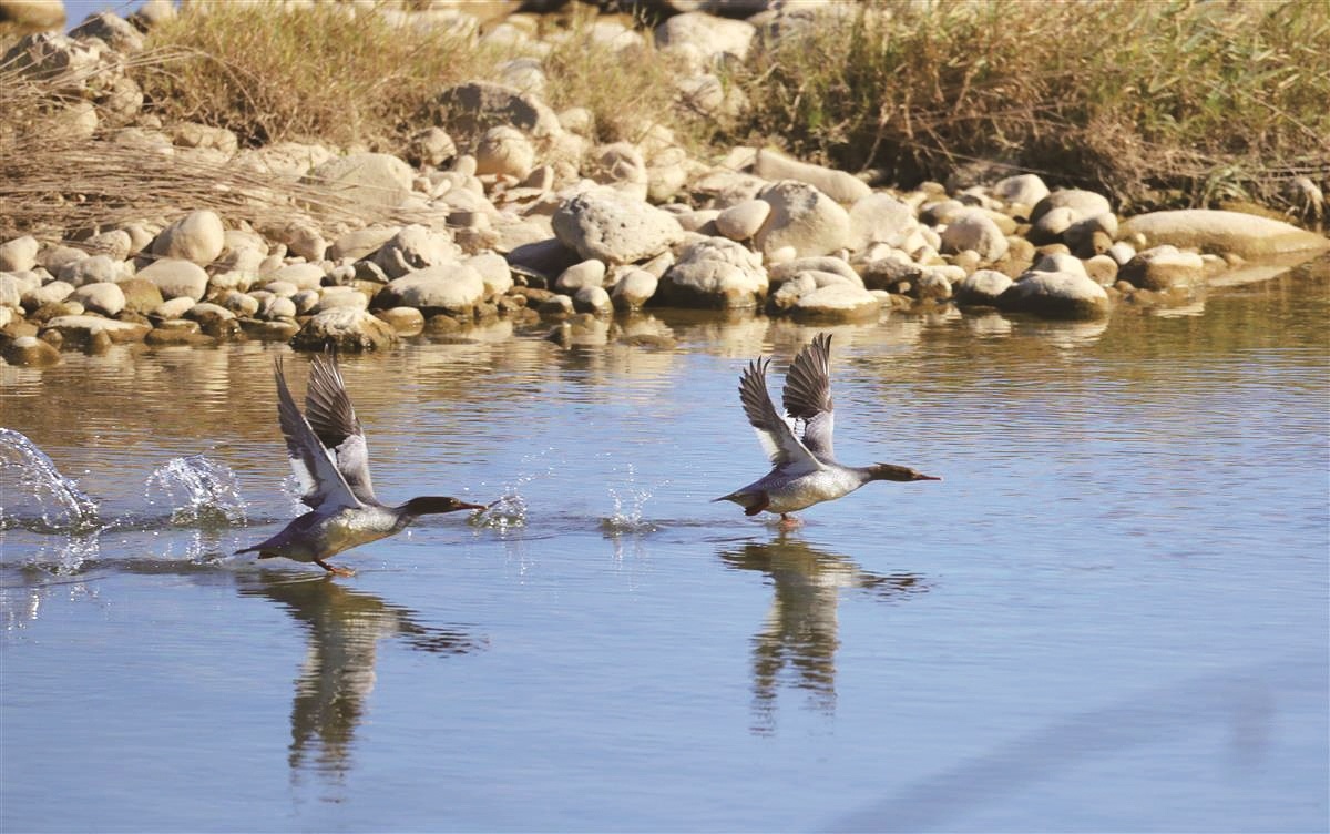 两只中华秋沙鸭在河面嬉戏飞翔。通讯员供图