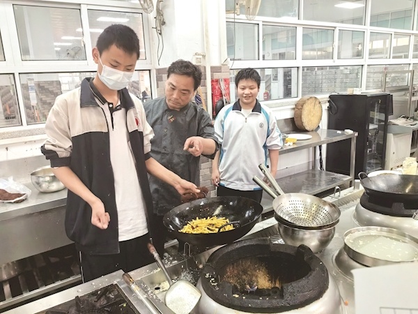 在中餐烹饪环节,武汉市财贸学校烹饪专业的冯柳老师和朱永忠老师为学生展示扬州炒饭、干煸土豆丝、糖醋里脊等中式热菜的制作。他们动作行云流水,做出的美味菜肴引发了学生们阵阵掌声。指导学生实操时,朱永忠提醒,要关注细节;冯柳则一边示范每个环节一边告诉孩子们,要干一行爱一行,干一行精一行。