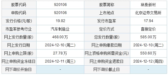 林泰新材2024年12月6日披露的向不特定合格投资者公开发行股票并在北京证券交易所上市发行公告显示,本次发行价格为19.82元/股,若本次发行成功,超额配售选择权行使前,预计公司募集资金总额为11,594.70万元,扣除发行费用1,911.09万元(不含增值税)后,预计募集资金净额为9,683.61万元;若超额配售选择权全额行使,预计公司募集资金总额为13,333.91万元,扣除发行费用2,085.41万元(不含增值税),预计募集资金净额为11,248.50万元。