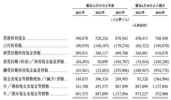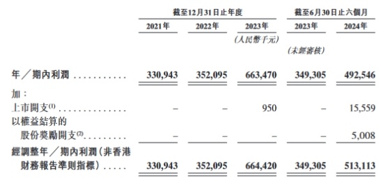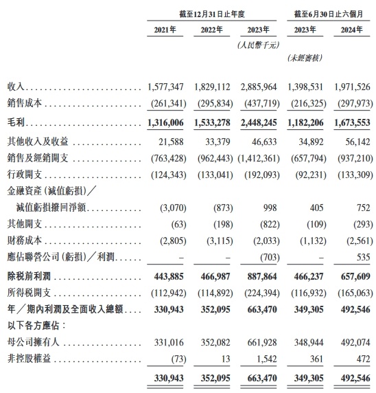 2021年、2022年、2023年以及截至2024年6月30日止六个月,公司的收入分别为1,577.3百万元、1,829.1百万元、2,886.0百万元、1,971.5百万元;年/期内利润分别为330.9百万元、352.1百万元、663.5百万元、492.5百万元;调整年/期内利润分别为330.9百万元、352.1百万元、664.4百万元、513.1百万元。