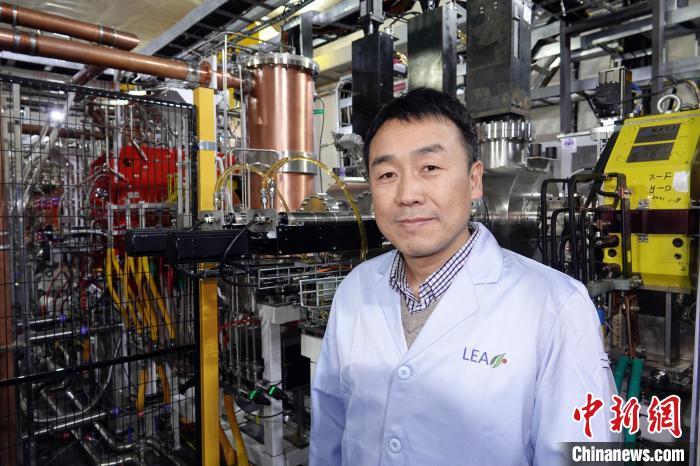 12月10日,孙良亭研究员在装置现场接受采访,介绍该装置超导离子源研制相关情况。中新网记者 孙自法 摄