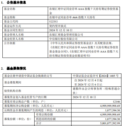 中国经济网北京12月11日讯 今日,农银汇理基金管理有限公司发布农银汇理中证同业存单AAA指数7天持有期证券投资基金基金合同生效公告。